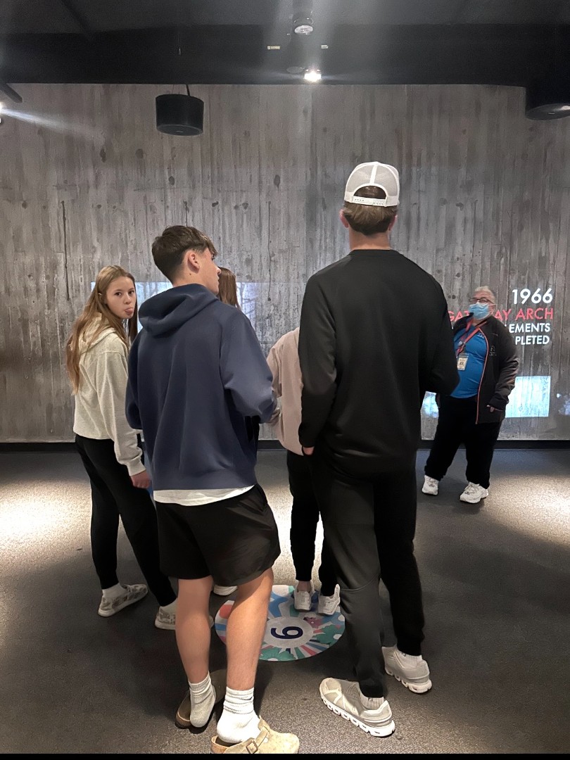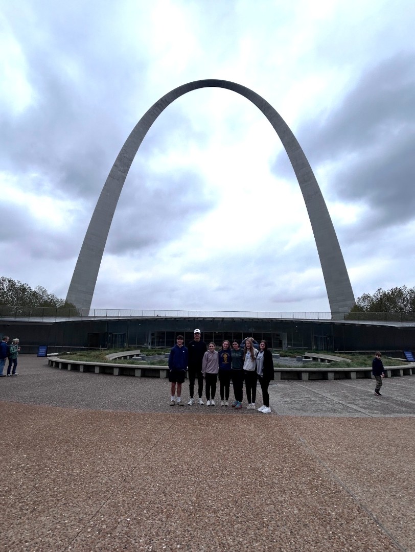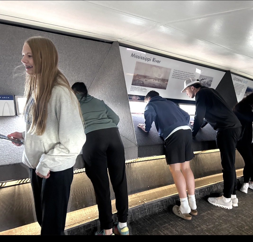 On our way to Indianapolis, we made a stop to visit the Gateway Arch in St. Louis, Missouri. There, we took the tram to the top of the Arch inside a small, uniquely designed barrel shaped capsule. When we were at the front of the line, our tour guide explained to us that five people could fit into a capsule and we divided ourselves into two groups of five and four (including Martin and Mrs. Dietz) (Picture one from left to right) Paxton Parsons, Carter Matthies, Addy Graham, Alexis Zimbelman, Presley Myers, Reagan Milne, and Ash Barnhart. The last three pictures were taken from inside the Arch.